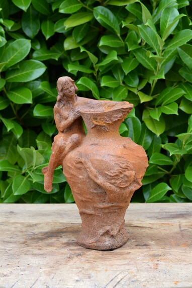 Gietijzeren vaas met vrouw knielend